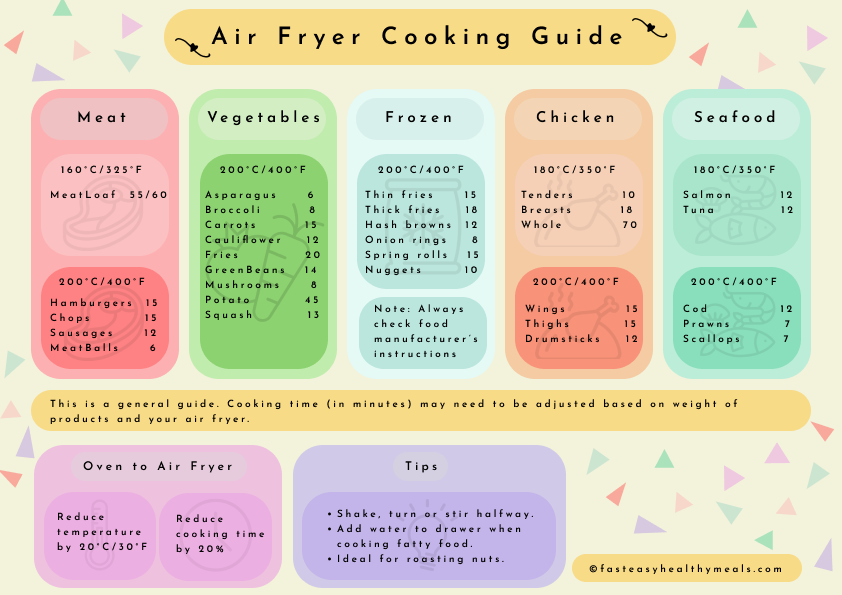 This is a general guide. Cooking time (in minutes) may need to be adjusted based on weight of products and your air fryer.